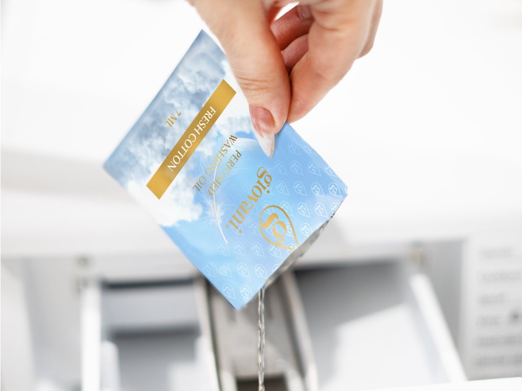 Parfumov za pranje ne dodajajte neposredno v boben stroja ali sušilnika. Namenjeni so neposredni uporabi v predalčku za mehčalec tkanin. Ni vam treba skrbeti, da bo vase perilo po sušenju v sušilniku izgubilo vonj. Dišave Giovani® so odporne na zunanje vplive in trajne. Oprano perilo bo tudi po uporabi sušilnika imelo prijeten vonj. Olja za pranje shranjujte pri temperaturi med 15-25° Celzija.